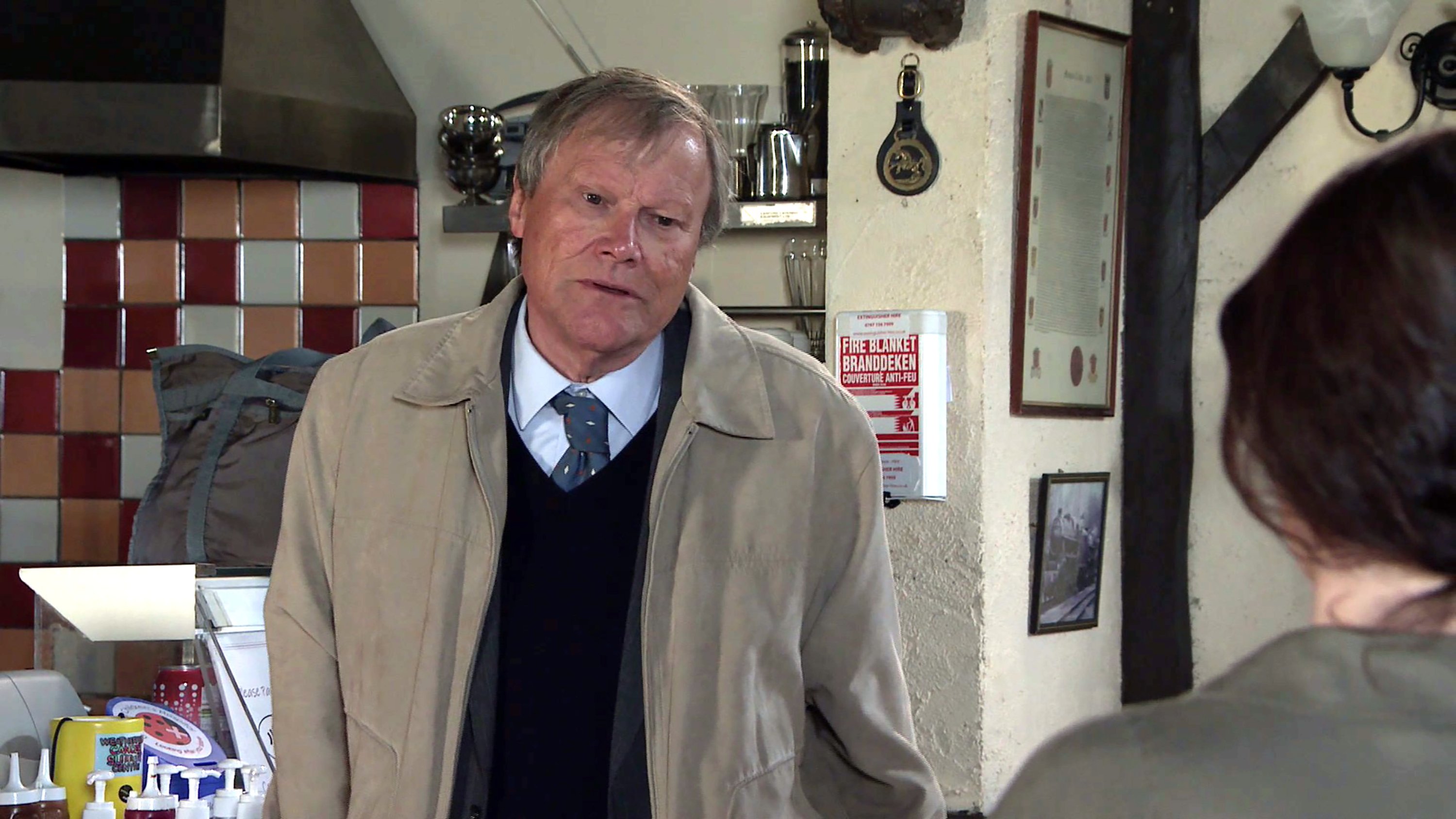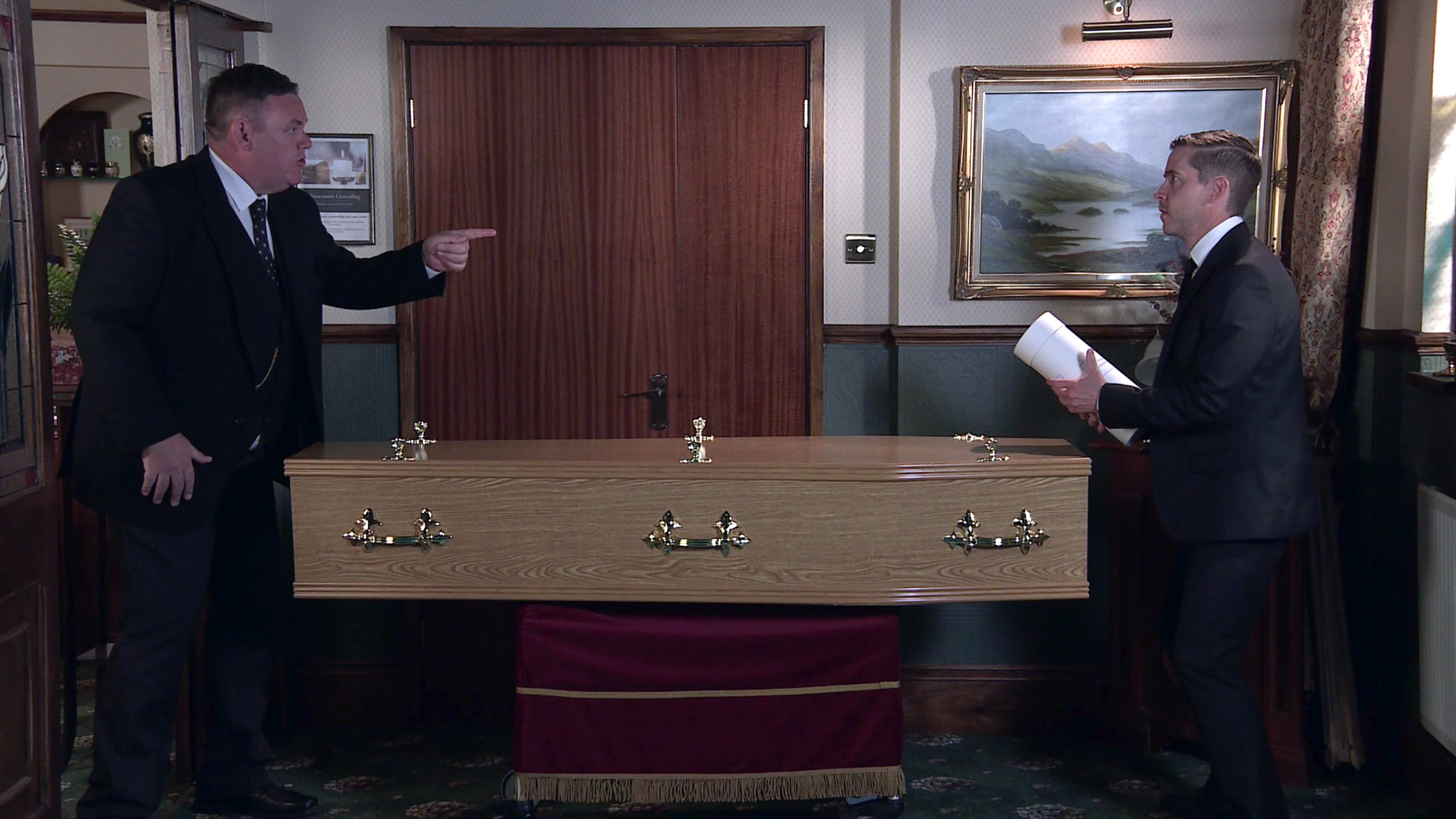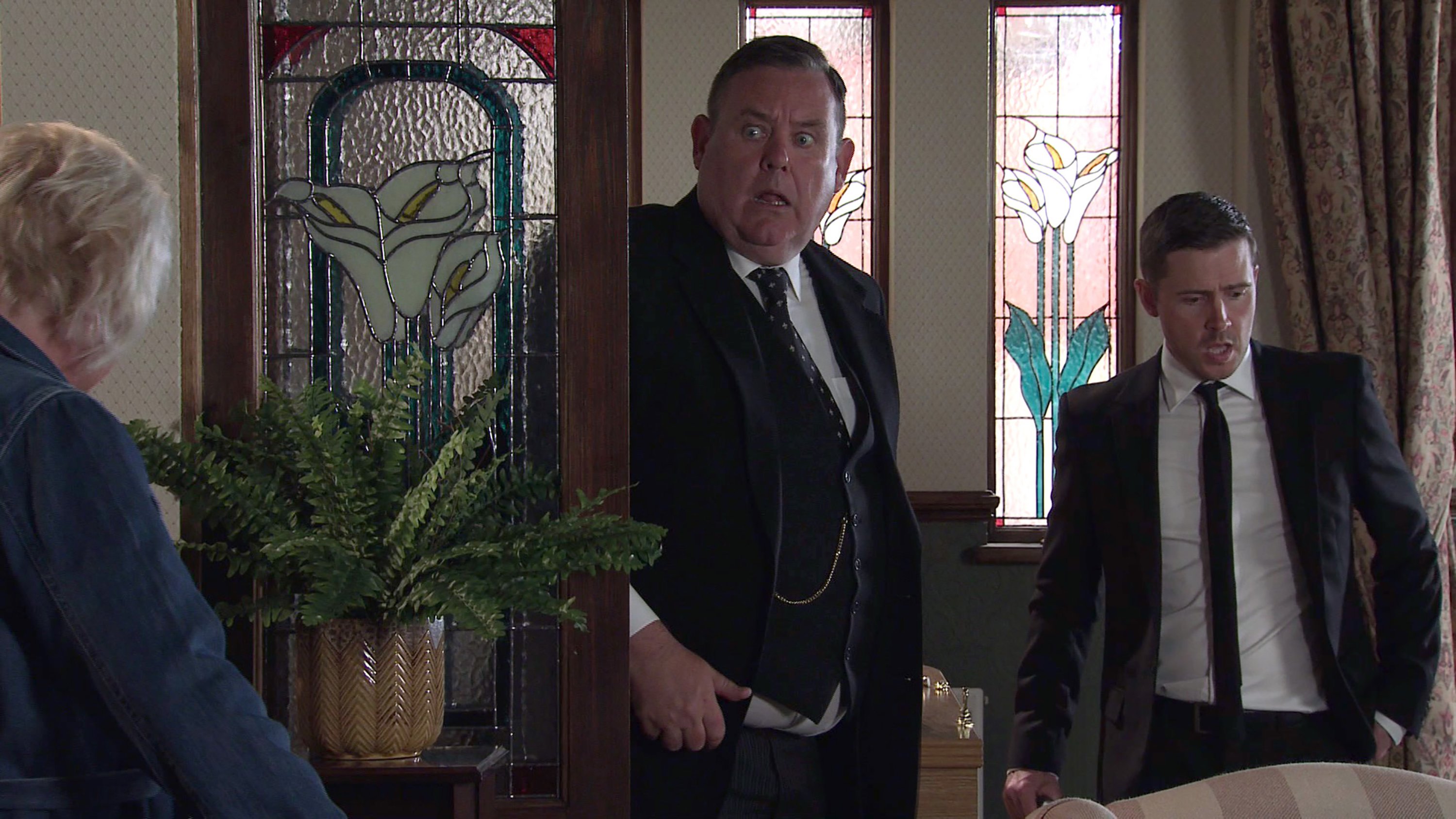 ELSEWHERE George chases Todd in a bid to retrieve Phelan’s ashes but Todd trips up, sending the ashes flying. George is furious as Eileen arrives to witness the mess. Todd makes out they’re the ashes of Patsy Freeman, a little old lady with no living relatives. Saddened by Patsy’s plight, Eileen tells George she’d like to give Patsy a send off. Todd masks his guilt.