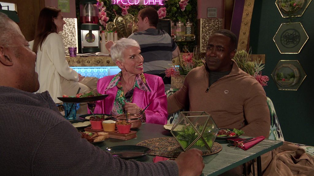 When Ed’s late for a celebratory meal at Speed Daal with Ronnie and Debbie, we wonder whether his gambling demons have got the better of him. When Adam finds out that Dee-Dee turned down a date with Joel in order to spend the evening with him, he engineers a plan to get them together.