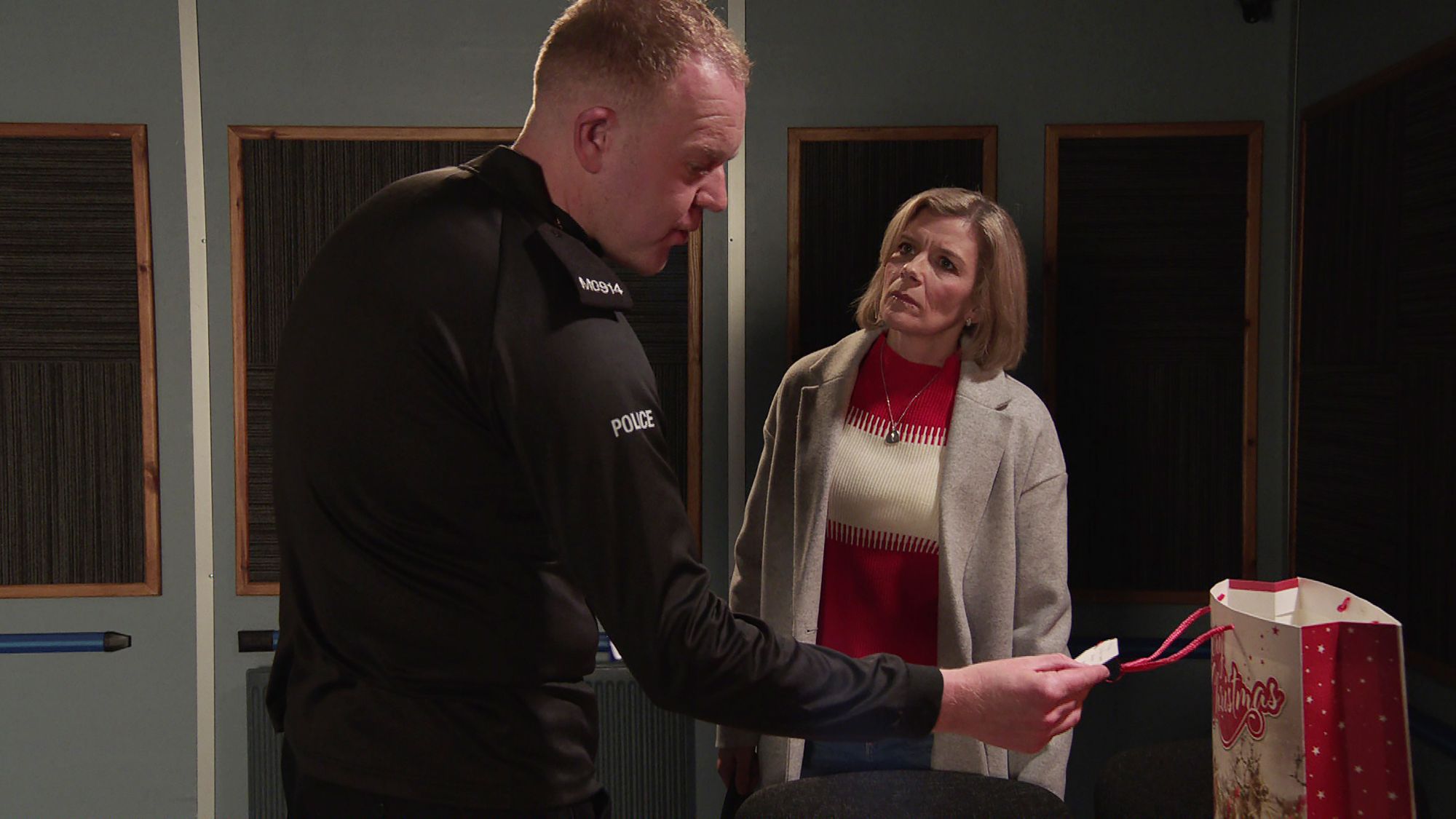 ● After sneaking a look inside Nick’s briefcase, Leanne is furious to see a wrapped Christmas present for Toyah. Leanne calls at the station and shows Craig a pile of presents from Nick to Toyah, making out that they are in it together.