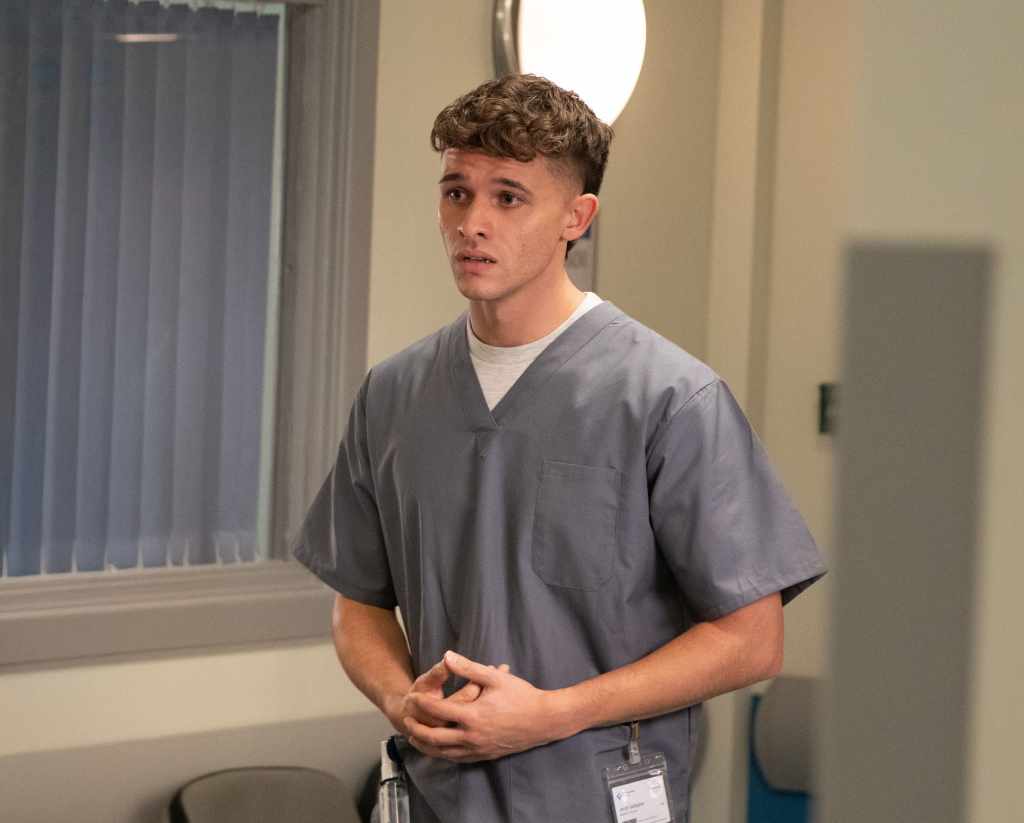 His supervisor Dr. Todd briefs an eager Jacob, he soon faces the stress of an incoming stab victim. Jacob recognises April’s purse on the victim and panics, calling Marlon. He is soon reprimanded by Doctor Todd for informing the family; she is clearly not pleased with his conduct. Jacob watches as Marlon and Rhona arrive, desperate for news. As time passes without updates on how the victim is doing, tensions in the family room rise. Eventually, Jacob is heartbroken as he watches a nurse enter to deliver devastating news to Marlon and Rhona.