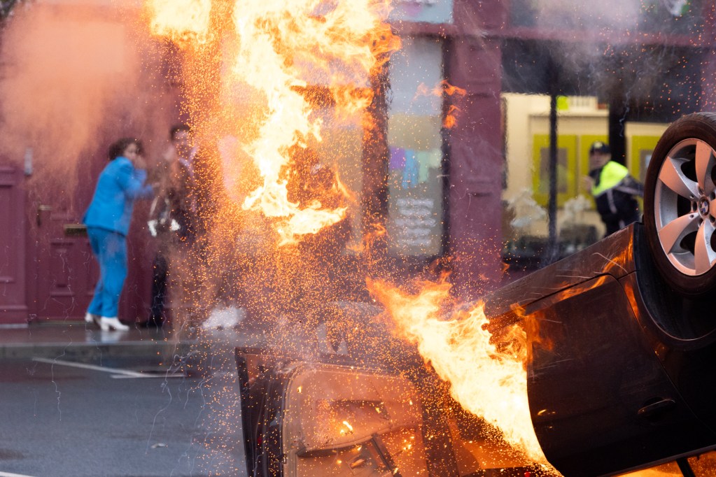 As Doug and Erica leave the chapel, their problems go from bad to worse as they narrowly miss the spinning wreckage. Rushing to help, they’re horrified to discover Hayley and James inside the mangled remains of the car.
