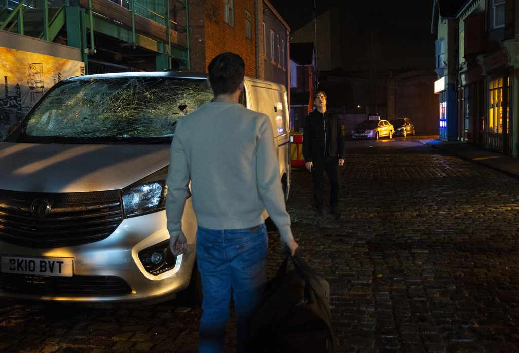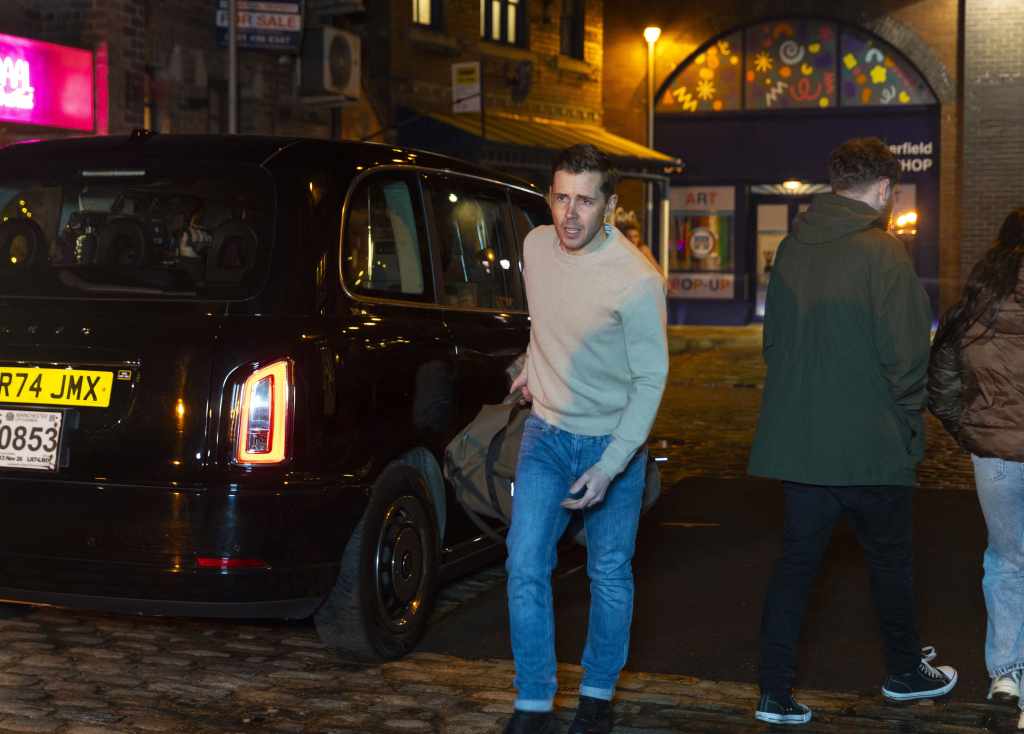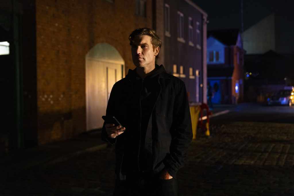Desperate to escape Todd sets off in a cab for the airport he realises he’s not got his phone and stops the cab but as he heads back down the street he comes face to face with Theo holding the phone.